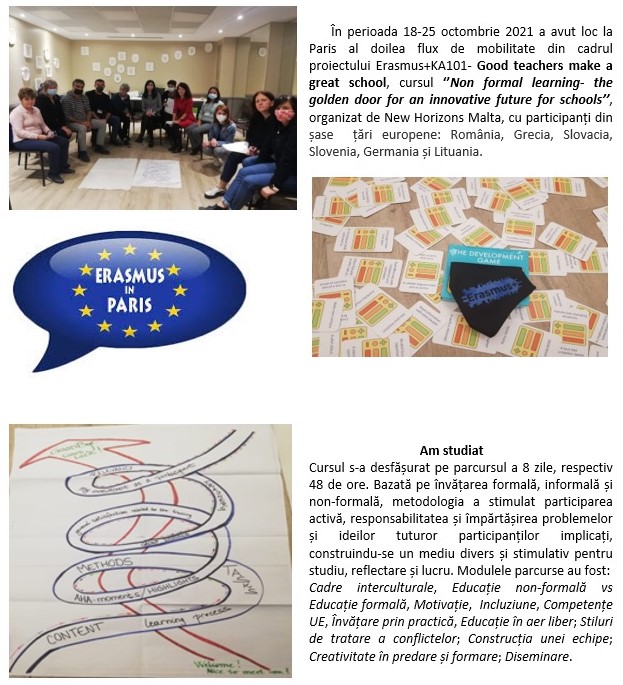 - flux 1,curs structurat: ‘’Non formal learning– the golden door for an innovative future for schools’’, vor participa 2 cadre didactice din liceu. Organizator: New Horizons Malta.