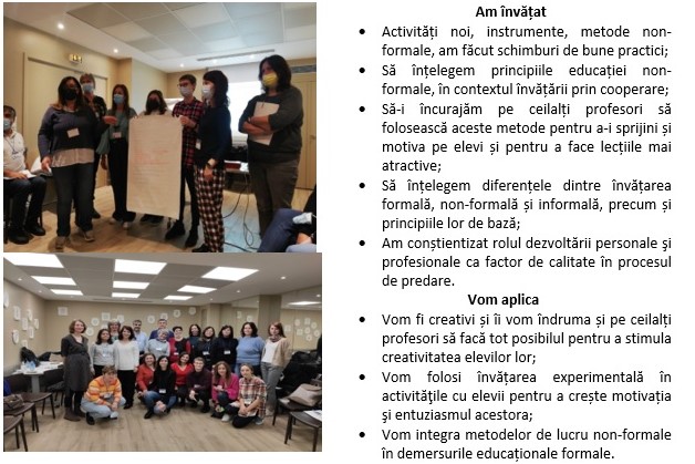 O1- îmbunătățirea competențelor pedagogice a șase cadre didactice în domeniul educației non-formale și de implementare a instrumentelor IT, pentru a lucra cu elevii cu risc de abandon școlar, în cadrul a trei sesiuni de formare.